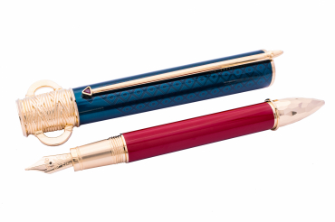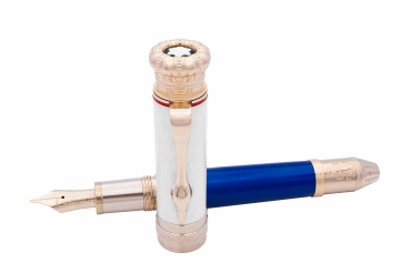 Les ornements du cône et du capuchon représentent des motifs antiques du vase Borghese. La forme du sommet du capuchon, couronné de l’emblème Montblanc en résine noire et blanche, évoque une coiffe de cardinal, tandis que le cône est serti d’une cornaline rouge frappée du portrait de Borghese. L’agrafe du stylo plume est inspirée des vieux pins parasols des magnifiques jardins de la villa. La plume en or massif de 18 K ruthénié est gravée des armories de la famille Borghese.