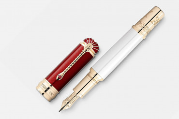 Les ornements du cône et du capuchon représentent des motifs antiques du vase Borghese. La forme du sommet du capuchon, couronné de l’emblème Montblanc en résine noire et blanche, évoque une coiffe de cardinal, tandis que le cône est serti d’une cornaline rouge frappée du portrait de Borghese. L’agrafe du stylo plume est inspirée des vieux pins parasols des magnifiques jardins de la villa. La plume en or massif de 18 K ruthénié est gravée des armories de la famille Borghese.
