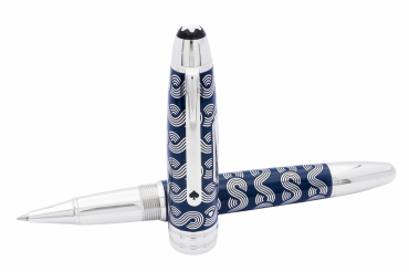La collection Meisterstück Around the World in 80 Days est inspirée par le fameux roman d’aventures de Jules Verne. Le rollerball Classique en résine précieuse bleue renvoie à la première partie du voyage. Ses personnages principaux voyagent de Londres à Bombay, essentiellement dans un bateau à vapeur, traversant la mer Méditerranée puis le canal de Suez. Le capuchon est gravé d'un motif représentant les éléments clés du roman : vagues, enseignes de cartes et une cartouche contenant un bateau à vapeur tracé au laser. Sur le sommet du capuchon figure la durée du voyage embossée, soit 80 jours dont 18 de Londres à Bombay. Collection Le Tour du Monde en 80 Jours.